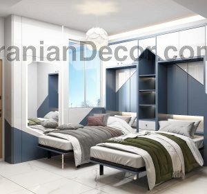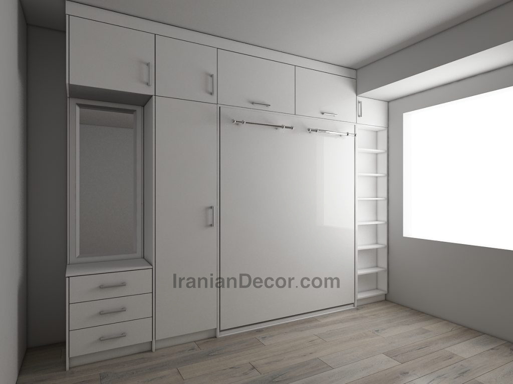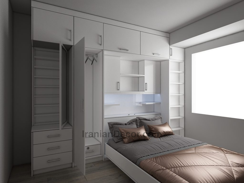 طراحی و اجرای تخت دونفره تاشو درکنار تعبیه کمد برای تمامی وسایل کاربردی از جمله لباس ها، وسایل آرایشی و بهداشتی، کمد برای چمدان ها و کتابخانه