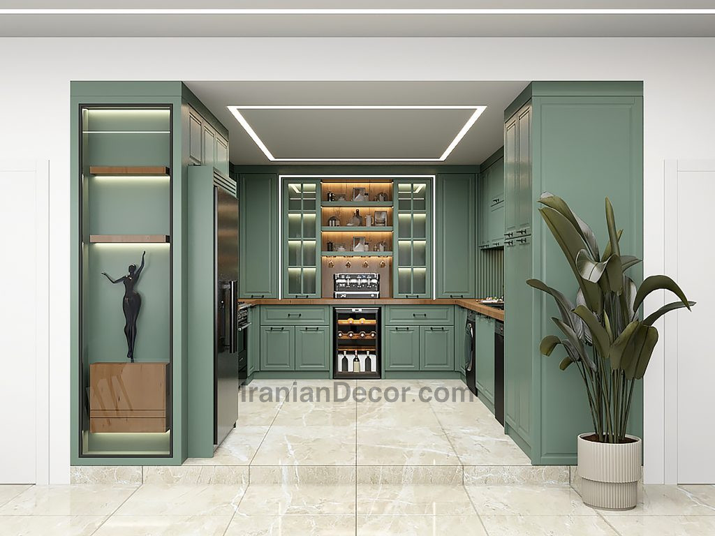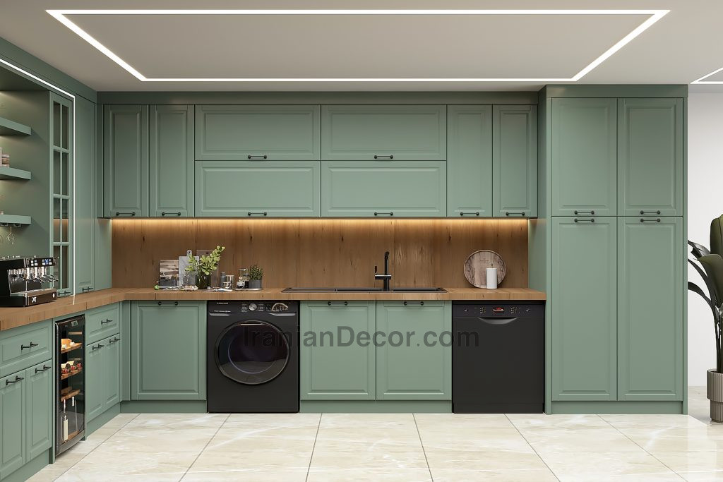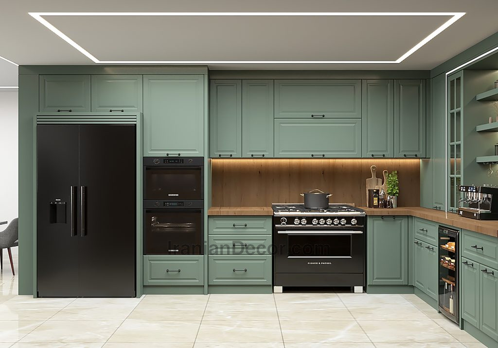 طراحی و اجرای پروژه کابینت نئوکلاسیکی که با ترکیب رنگی ترند این روزها برای آشپزخانه اجرا شد؛ یعنی سبز و رنگ چوب.