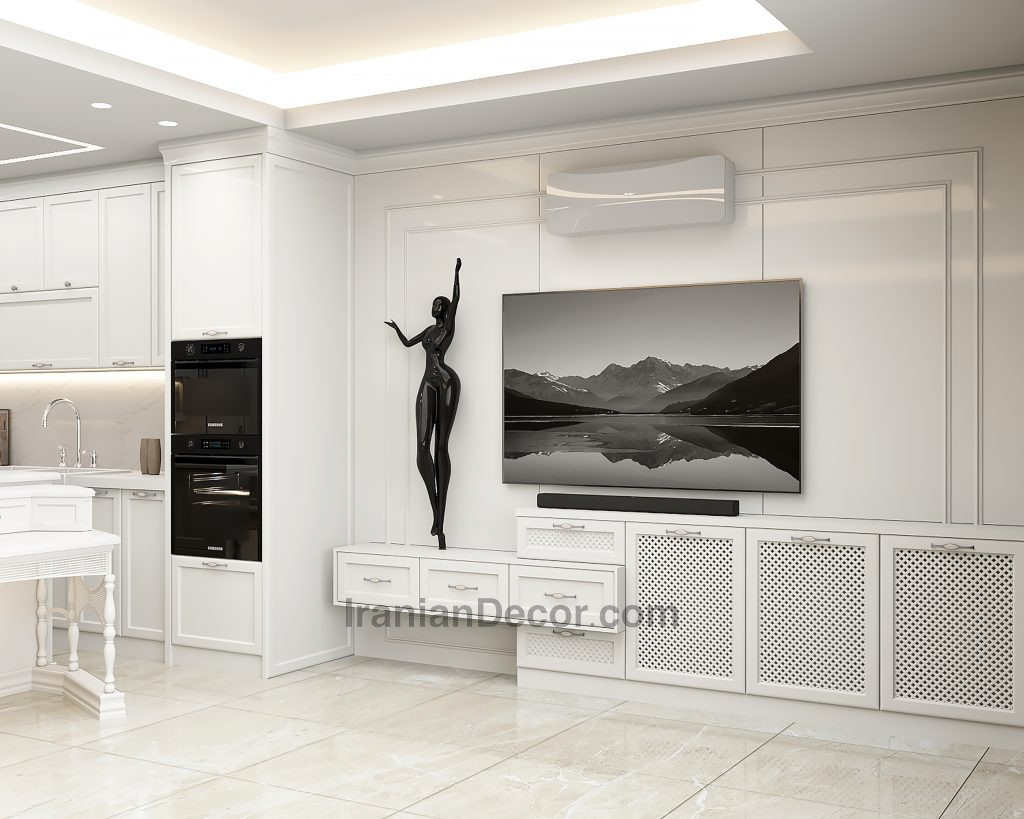 طراحی و اجرای تی وی وال خاص شامل دیوارکوب های بکگراند فضا و باکس های تی وی
