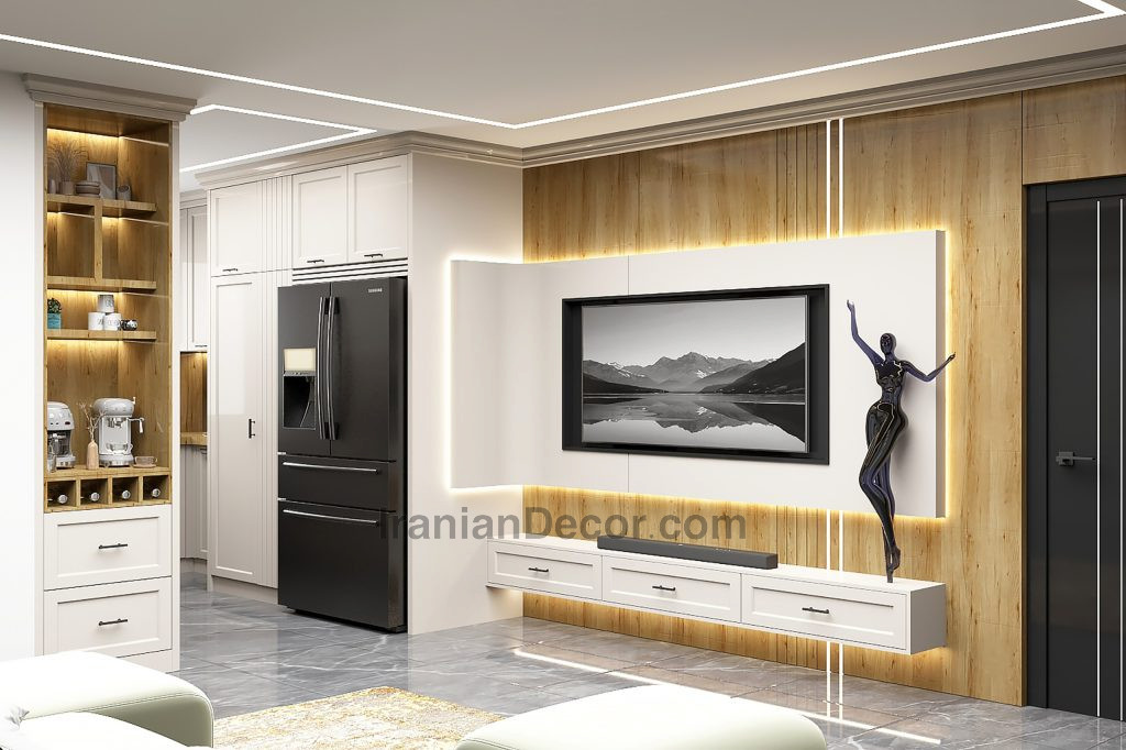 دکور تی وی وال با طراحی هماهنگ با آشپزخانه و استفاده از ترکیب رنگی روشن و طرح چوب که در عین سادگی، گرمای ملایمی به محیط اضافه میکند.