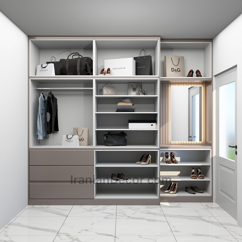 استفاده از کمدهای بزرگ و جادار مناسب برای نگهداری از لباس و کفش های زیاد با جانمایی فضاهای لازم از قبیل آینه و کشوهای کاربردی درکنار آویز لباس ها.