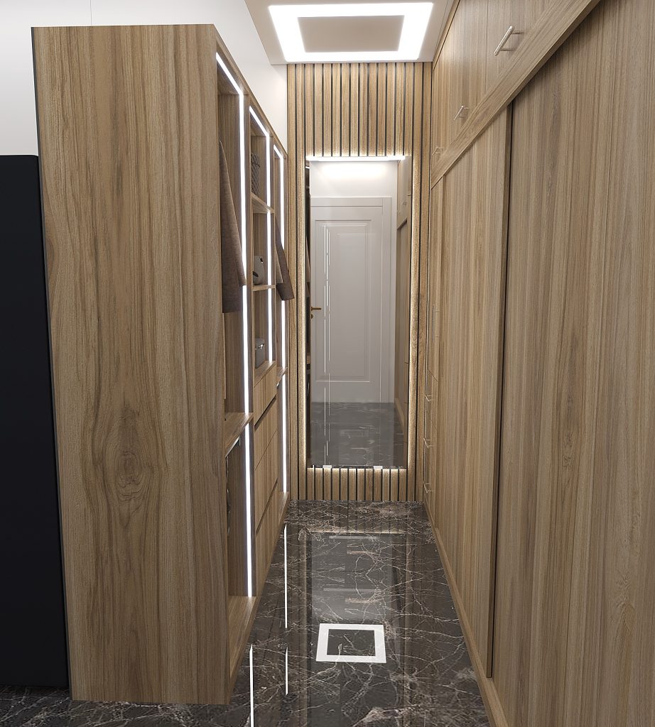 جانمایی فضایی برای آویز لباس های مهمان و جاکفشی درکنار درب ورودی برای بهینه و کاربردی سازی محیط.