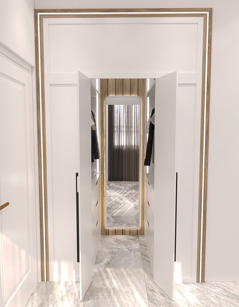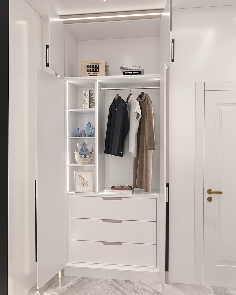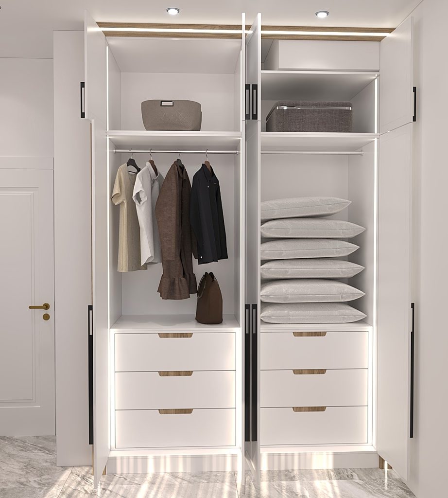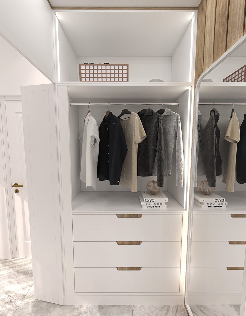 جانمایی فضاهای مختلف اعم از آویز لباس، انبار، شلف برای کتابخانه و تعبیه مینی کلوزت برای انواع لباس ها.