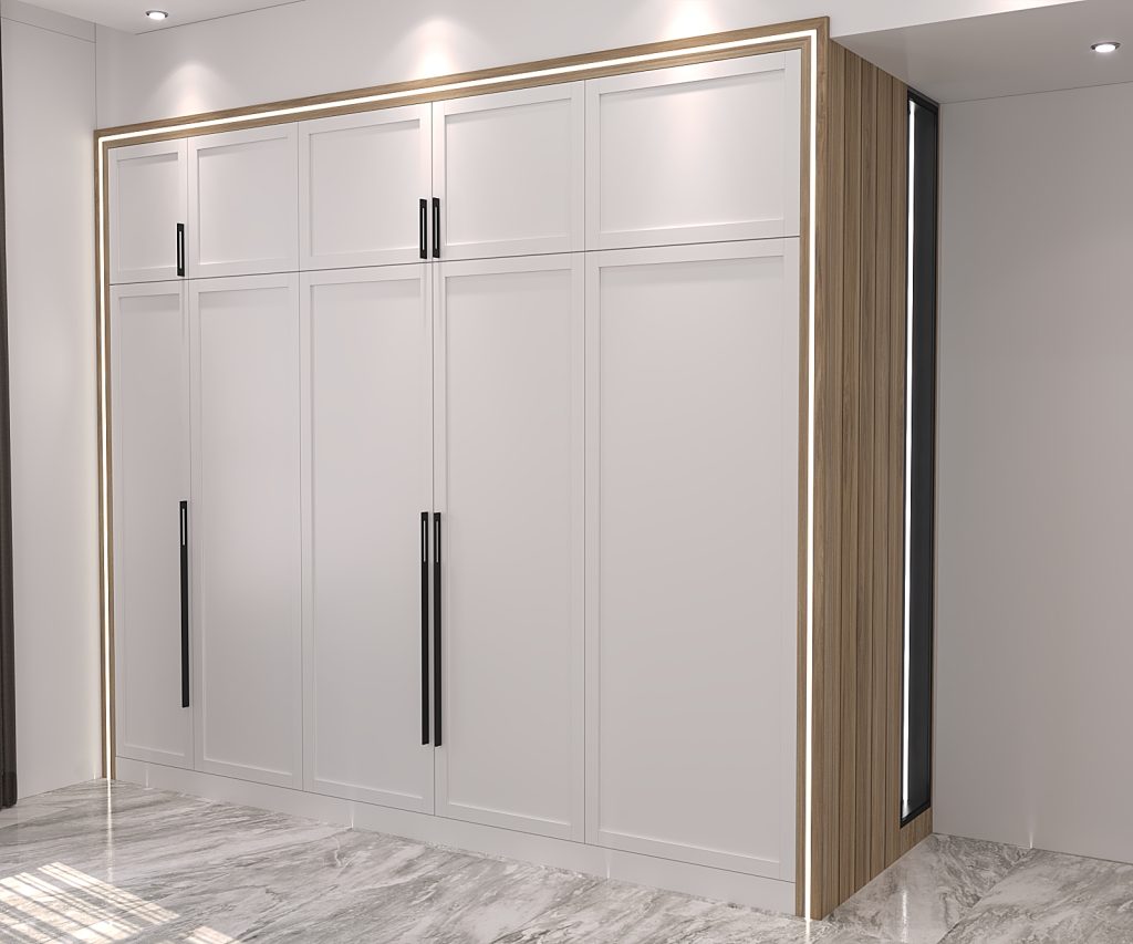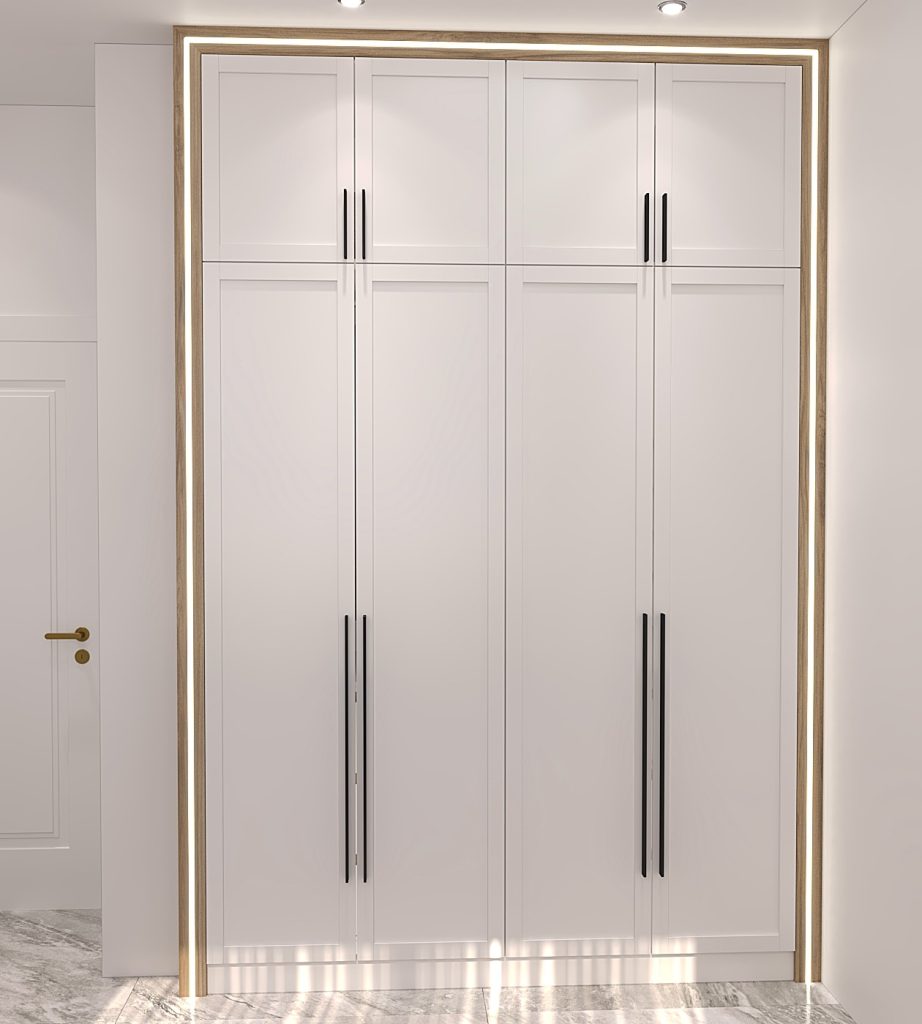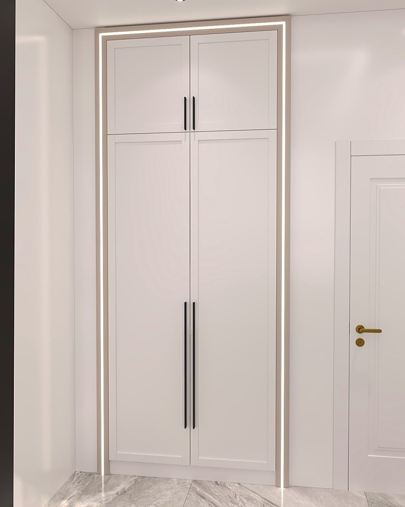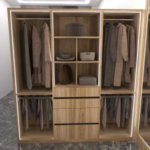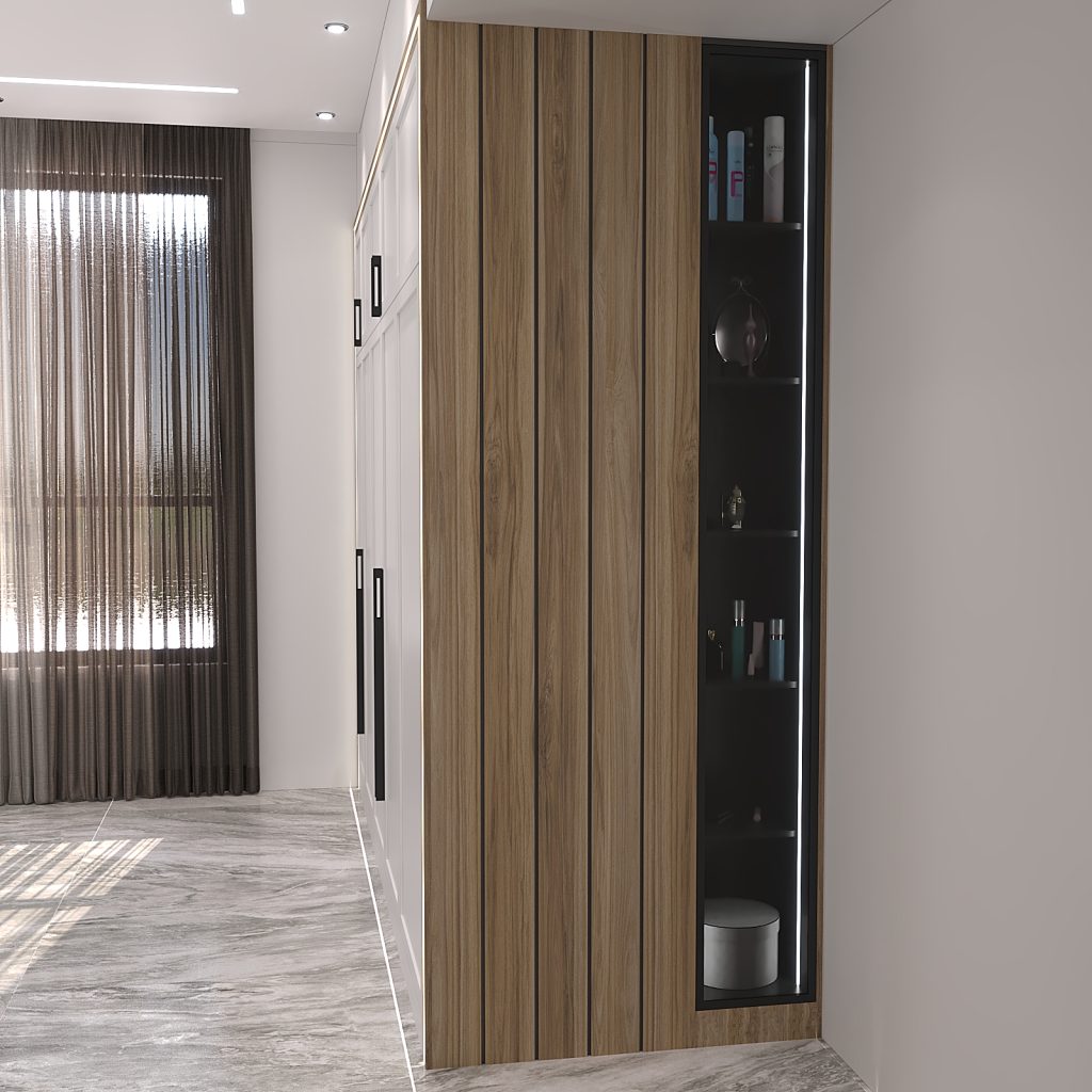 جانمایی فضاهای مختلف اعم از آویز لباس، انبار، شلف برای کتابخانه و تعبیه مینی کلوزت برای انواع لباس ها.